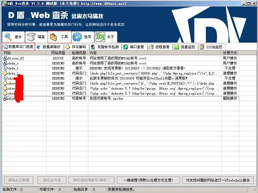 特别针对 DEDECMS 数据库里的后门数据进行检测,并对使用高权限数据库帐号(如:Mysql的root帐号)进行提示,并支持降权操作,